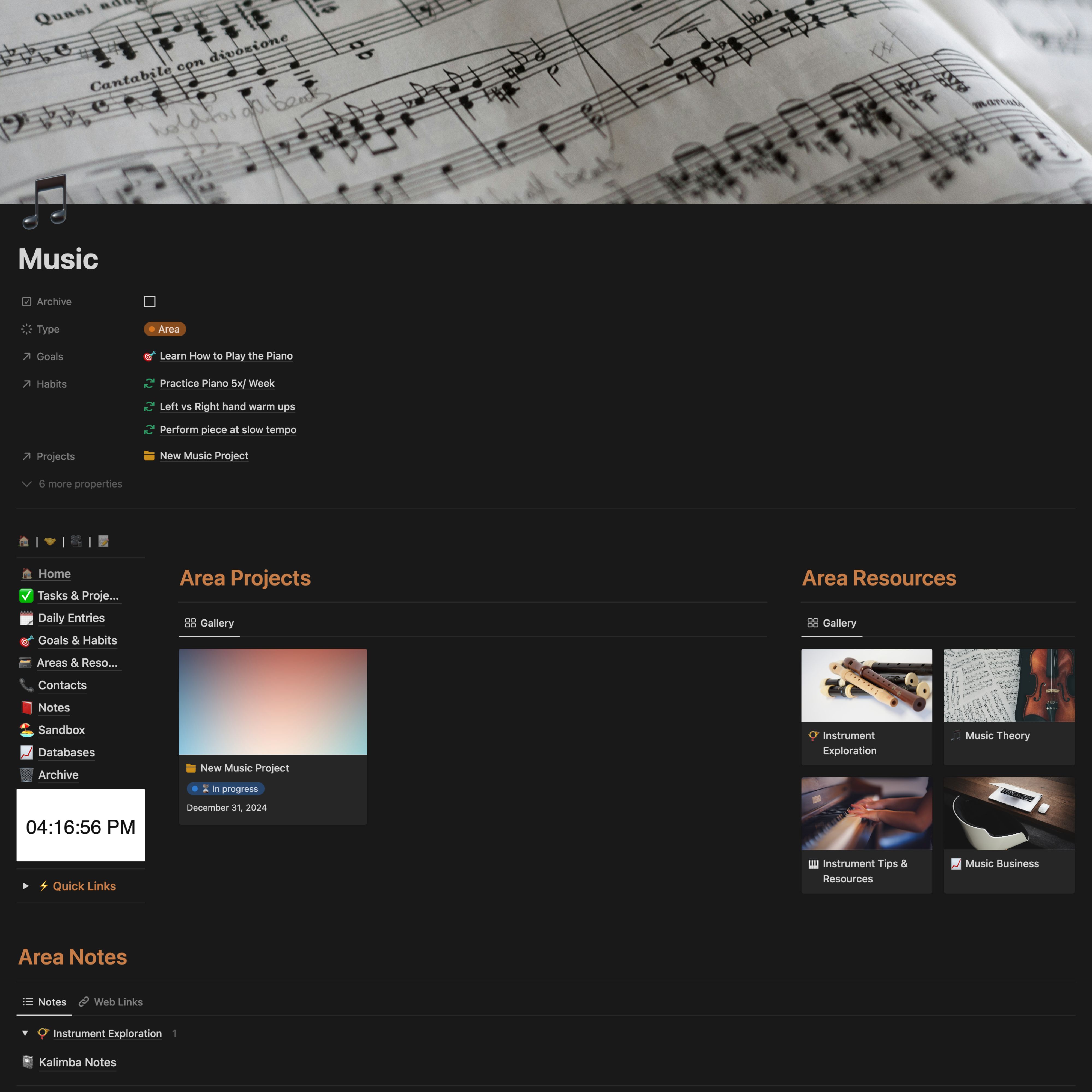 Harness the power of your musical knowledge! The Maestro Mind Accelerator is your centralized hub, ensuring everything music-related remains organized and accessible. Categorize resources, notes, and online courses into dedicated Areas, streamlining your workflow and maximizing your learning potential. Capture fleeting ideas, record pivotal learning moments with a clear note-taking system, and utilize Note Type tags to filter for the information you need. Build a comprehensive musical knowledge base that propels your continuous growth!