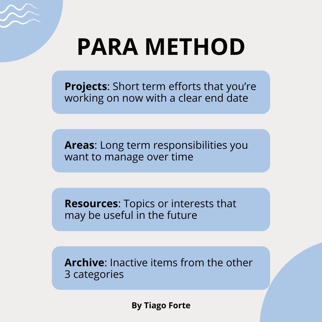 The very foundation of this Accelerator is built on Tiago Forte's PARA Method: a simple and flexible system for organizing digital information