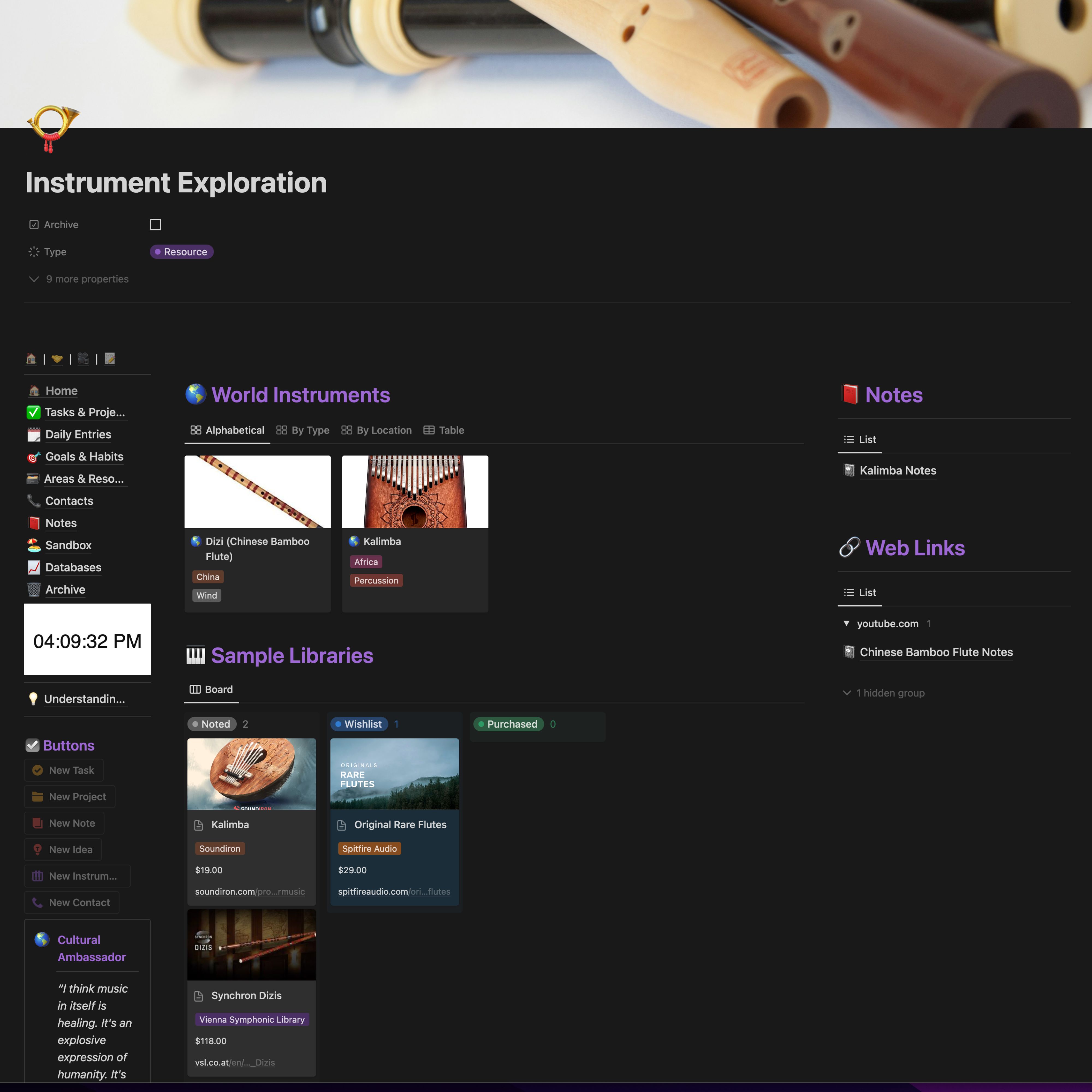 Break free creatively! The Genre Exploration Challenges guide you through a diverse range of styles, offering structured experimentation that sparks fresh inspiration for your own music. Expand your sonic palette further with the dedicated Instrument Exploration database. Research fascinating instruments, log your discoveries, and even connect your findings with existing or potential sample libraries for seamless exploration. Incorporate these new influences into your work and take your music to the next level!
