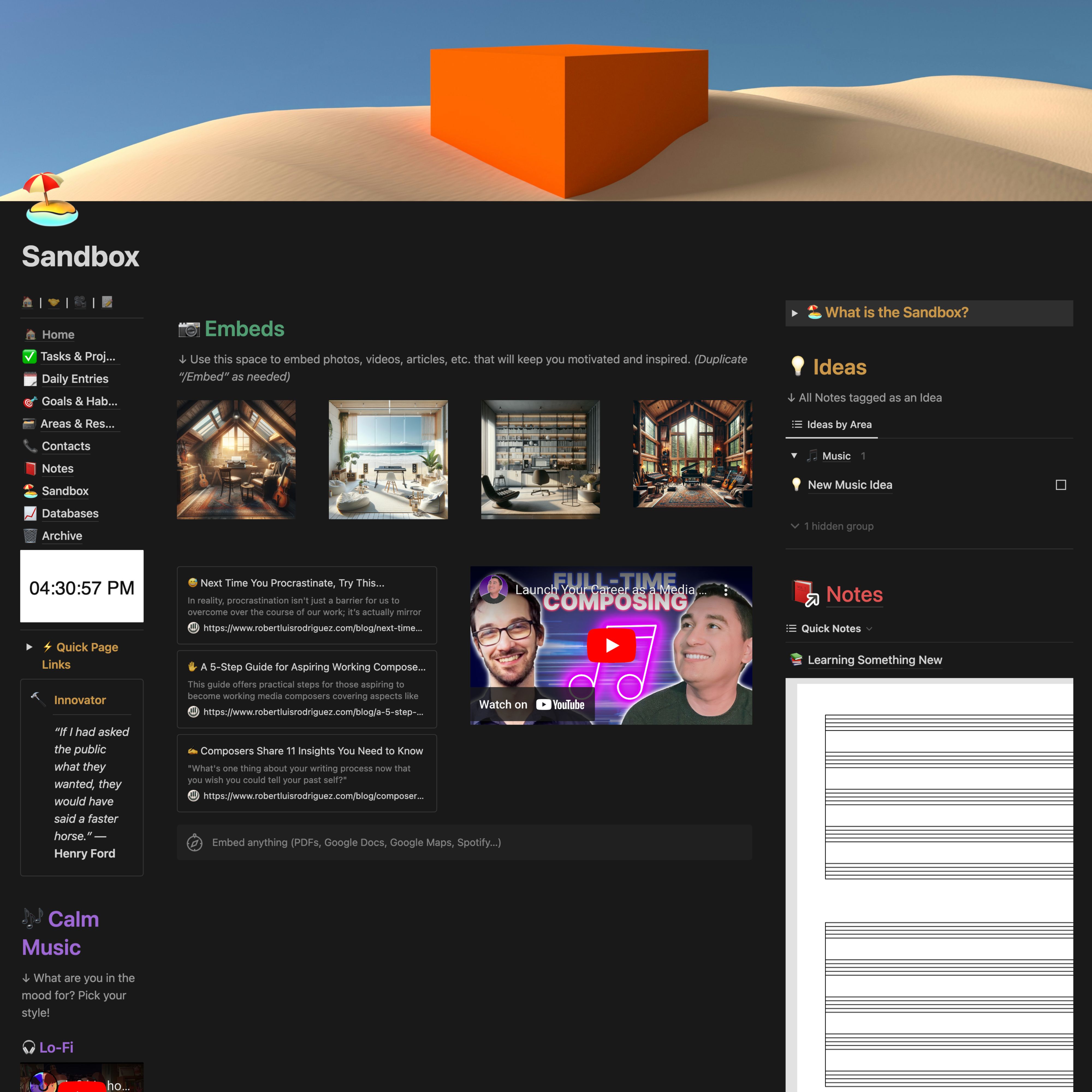 Unleash your creativity in the Sandbox! This dedicated space within the Maestro Mind Accelerator is perfect for free exploration, jotting down spontaneous ideas, and experimenting without constraints. Utilize it as a launchpad for new projects, a place to capture fleeting inspiration, or simply to play with musical concepts without the pressure of a formal task or goal. Fuel your innovative spirit and embrace the power of unrestricted experimentation!